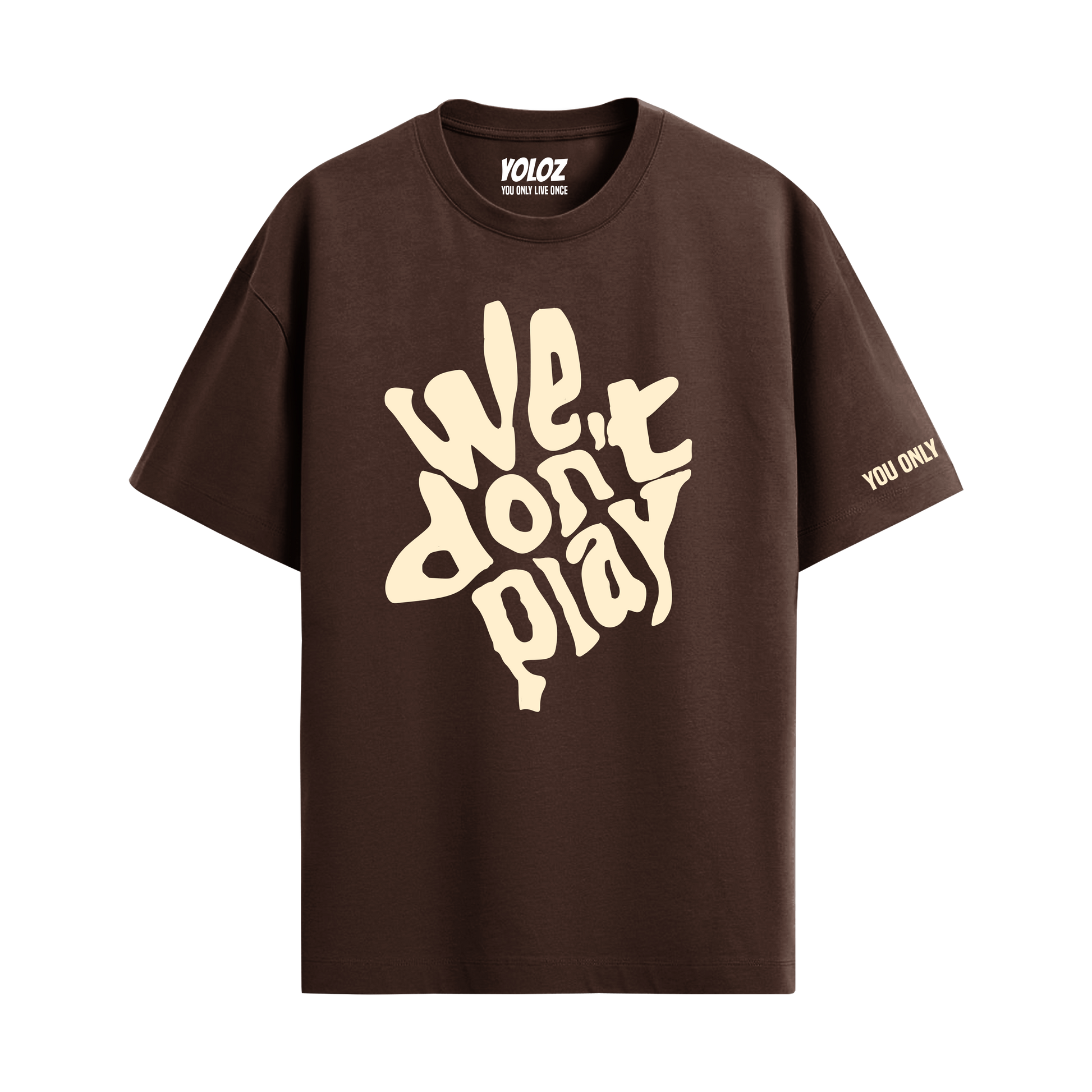 - Design: Eye-catching "We Don't Play" statement print on a brown base