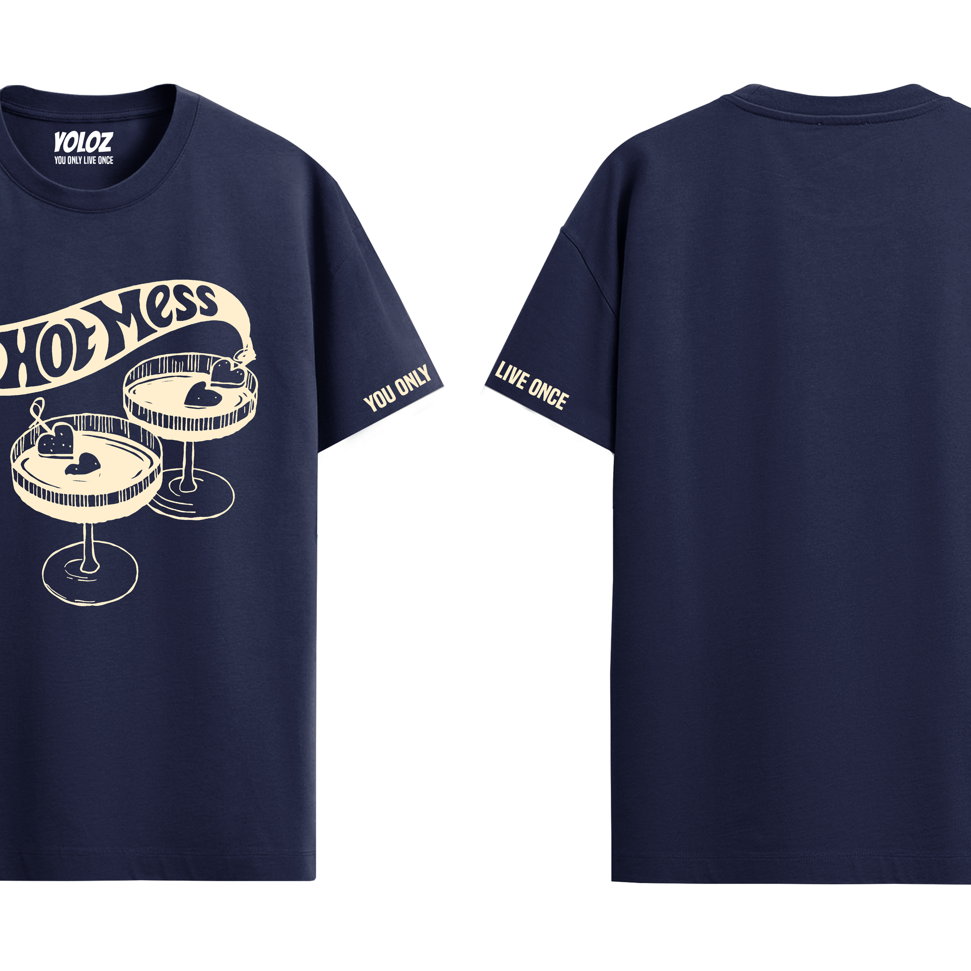 - Design: "Hot Mess" typography print on a deep navy blue base