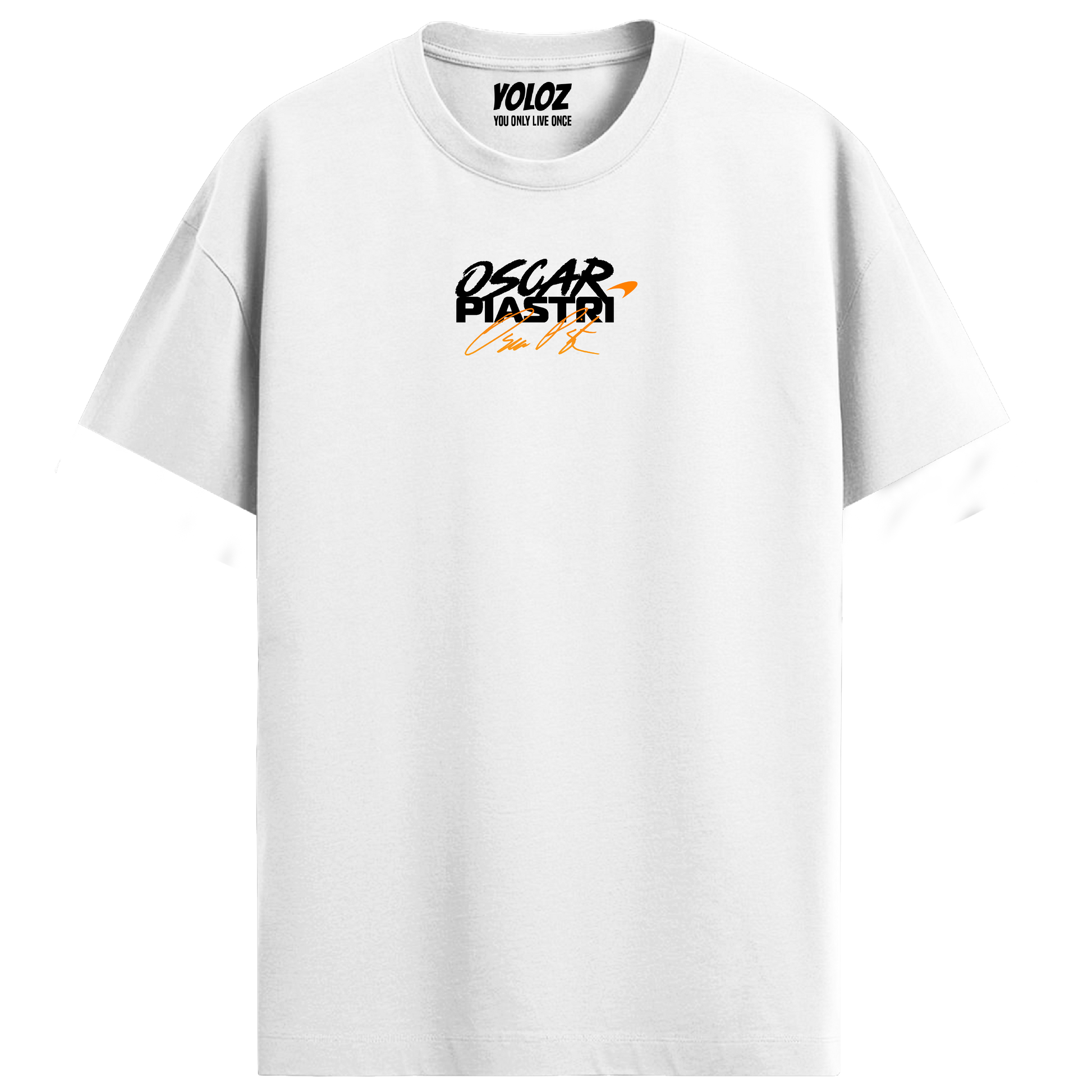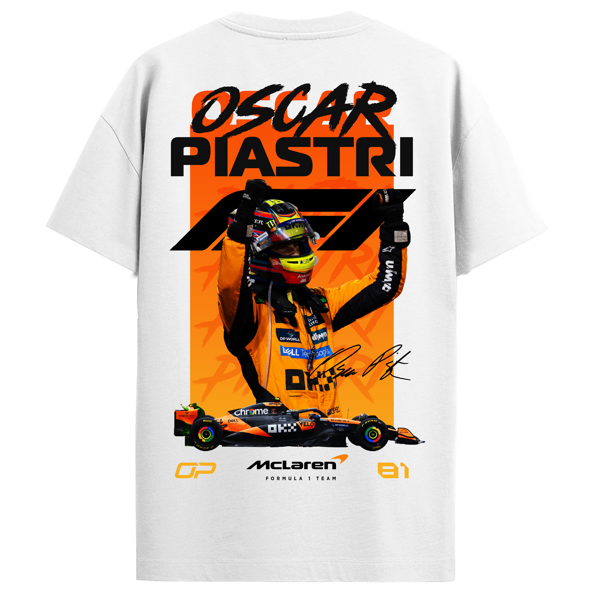Signature Graphic Design – Oscar Piastri, McLaren branding, and car print for authentic fanwear