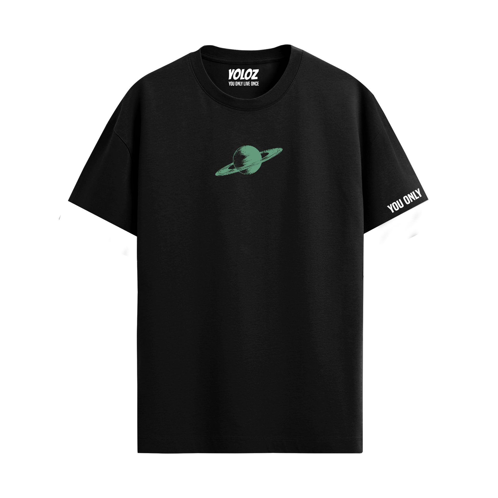 - Design: Saturn celestial print on a black base